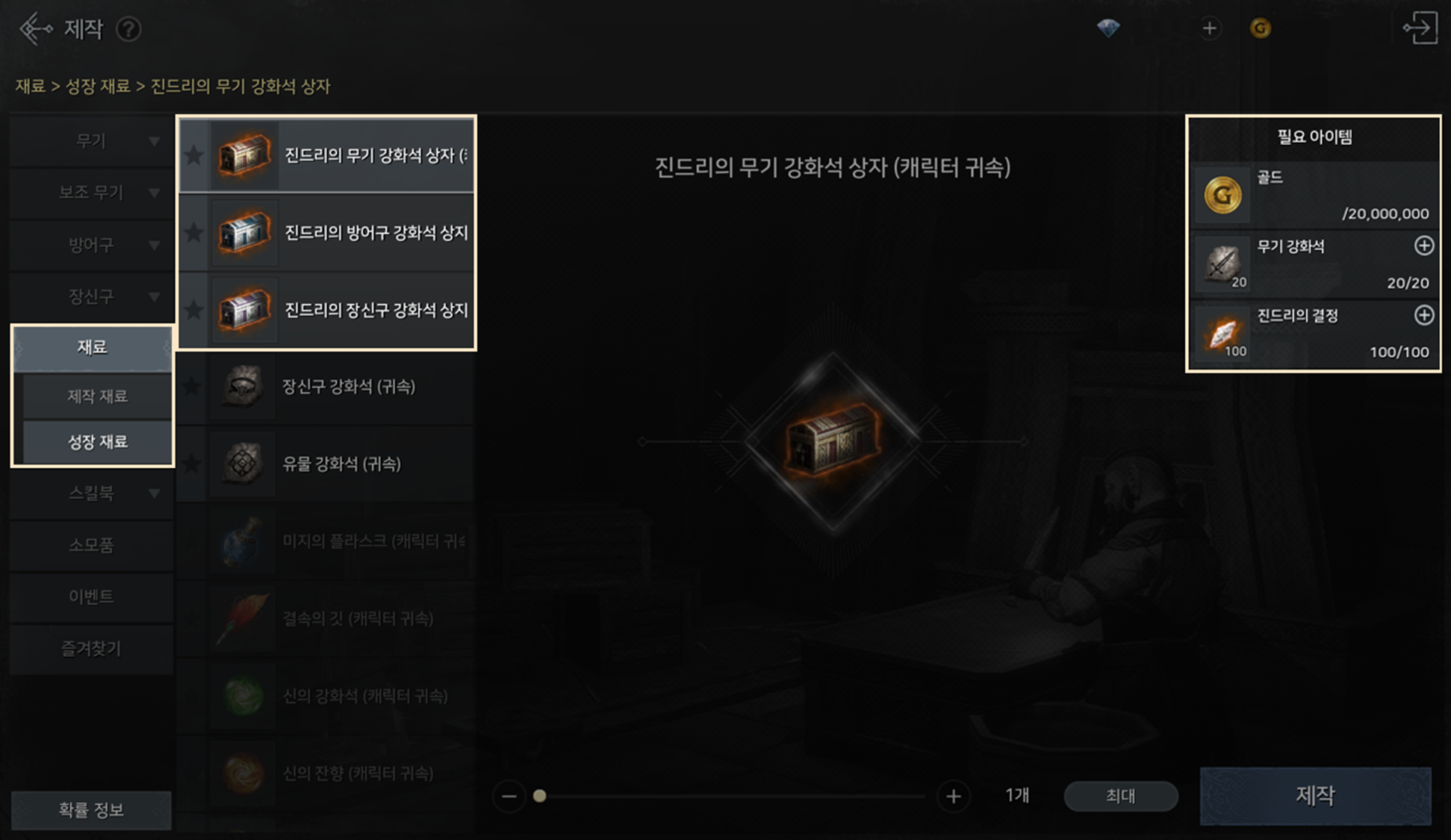 · 「金德莉的武器/防具/飾品強化石盒」可以在【材料 - 成長材料】標籤頁中製作。