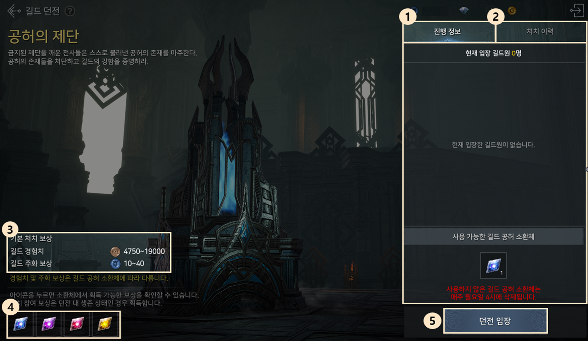 ① 進度資訊:顯示目前線上的公會成員、可用時間以及你擁有的公會虛空召喚水晶數量。 ②